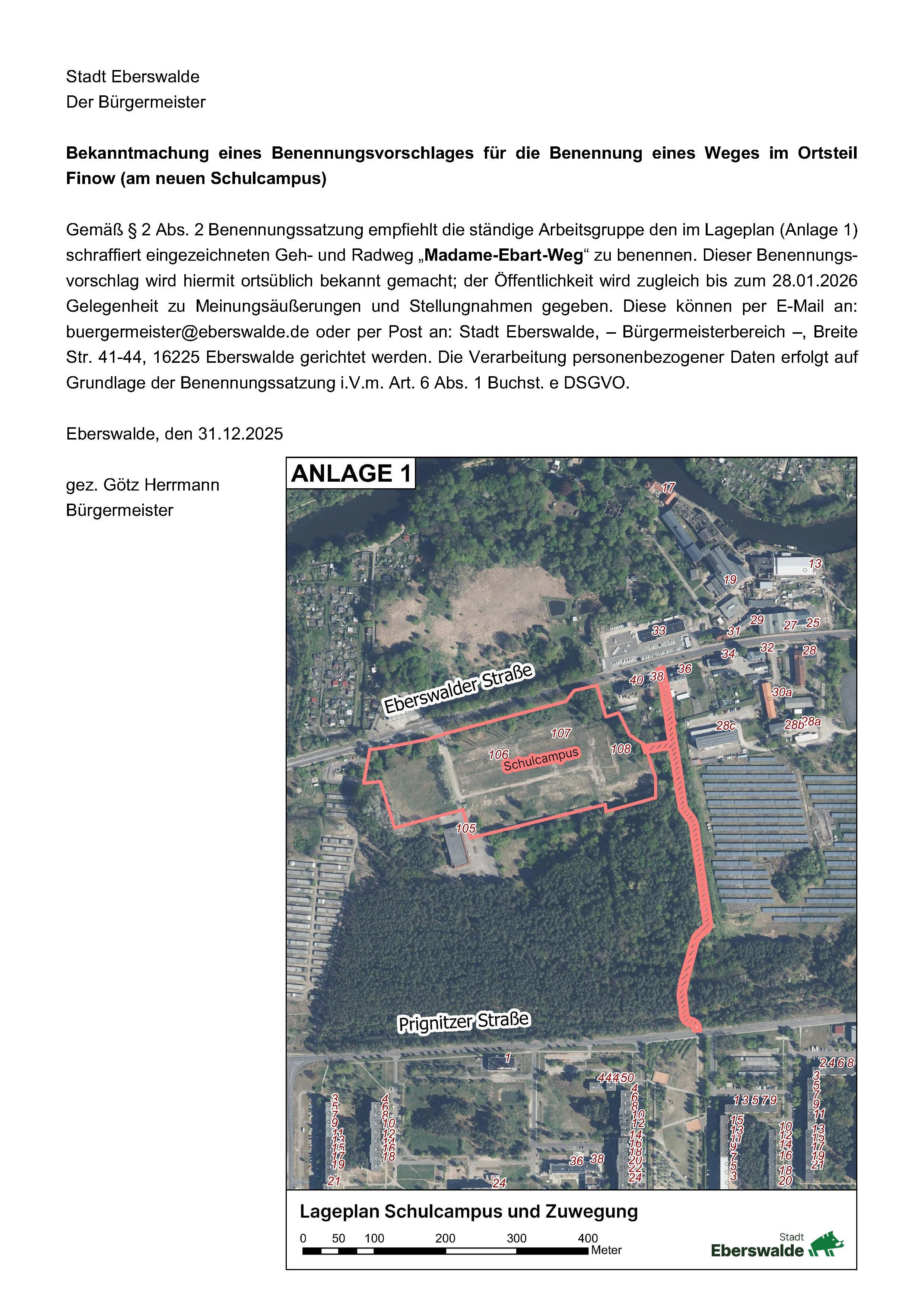 | 31.12.2025 | 20251231 2 Öffentliche Bekanntmachung Benennungsvorschlag Madame Ebart Weg Internet | jpg - 1,042 MB | Download |